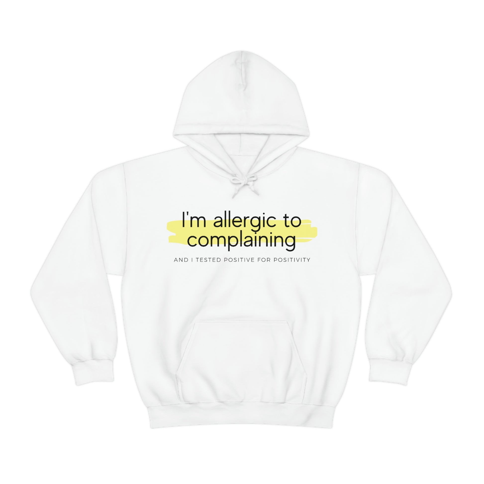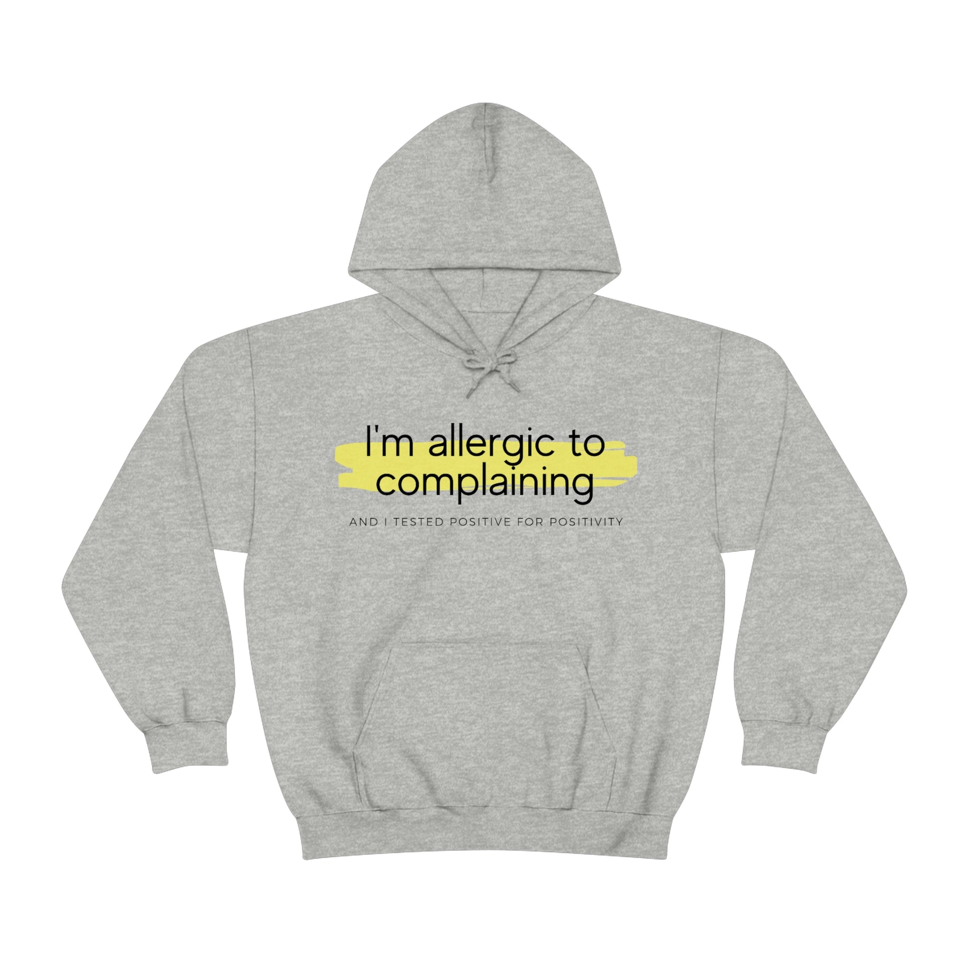 This unisex heavy blend hooded sweatshirt is relaxation itself. It features Faith Happy original saying "I'm allergic to complaining, and I tested positive for positivity". Made with a thick blend of cotton and polyester, it feels plush, soft and warm, a perfect choice for any cold day. In the front, the spacious kangaroo pocket adds daily practicality while the hood's drawstring is the same color as the base sweater for extra style points.