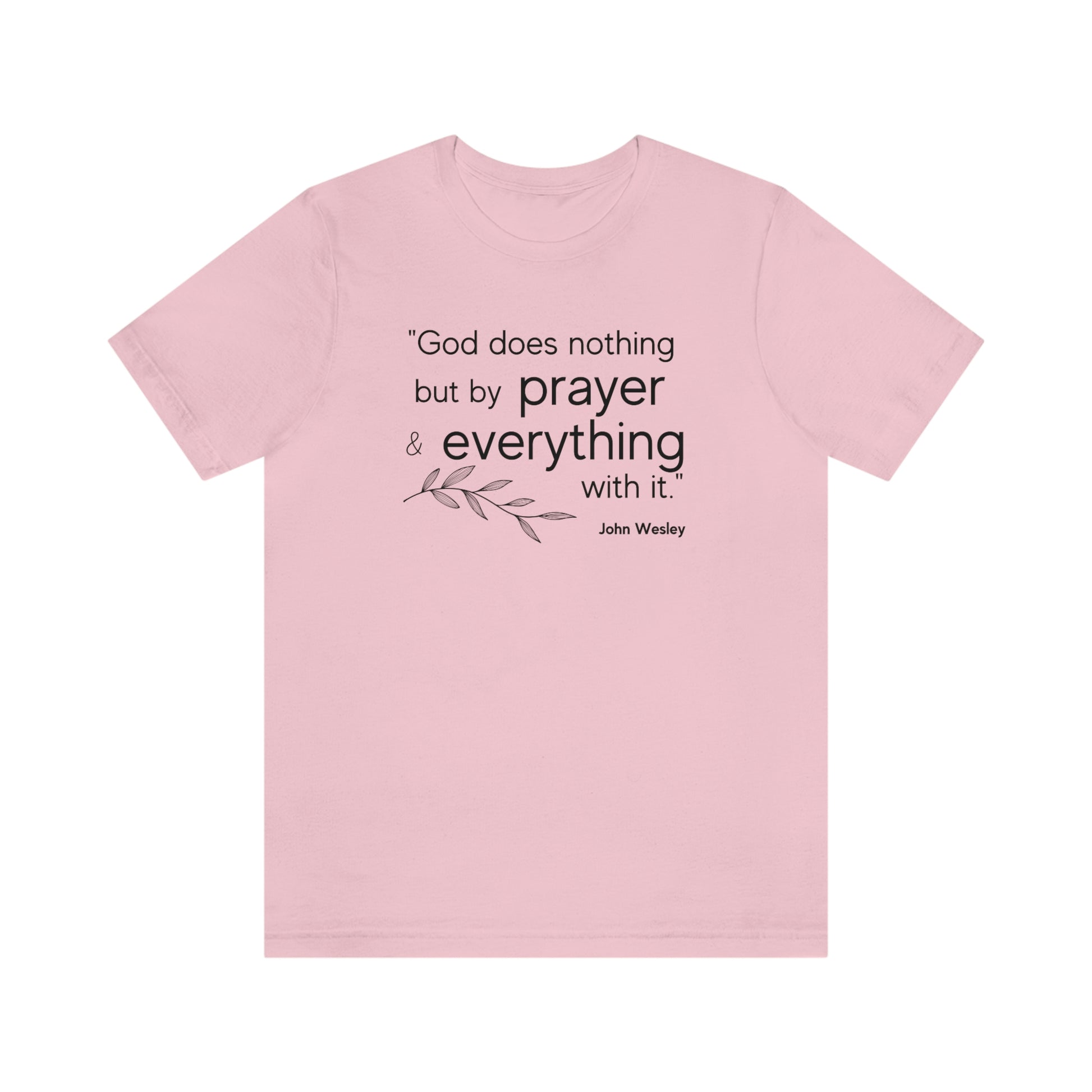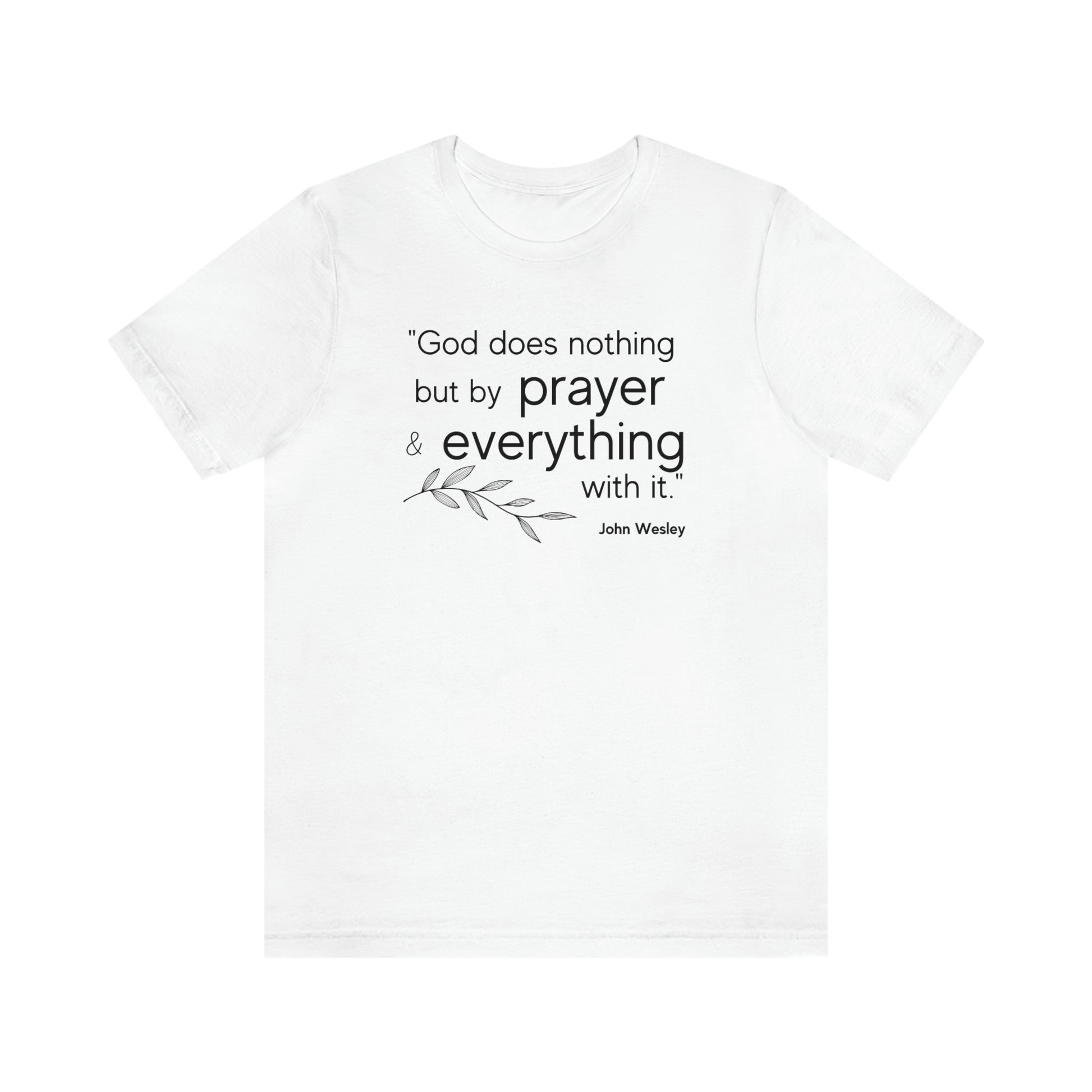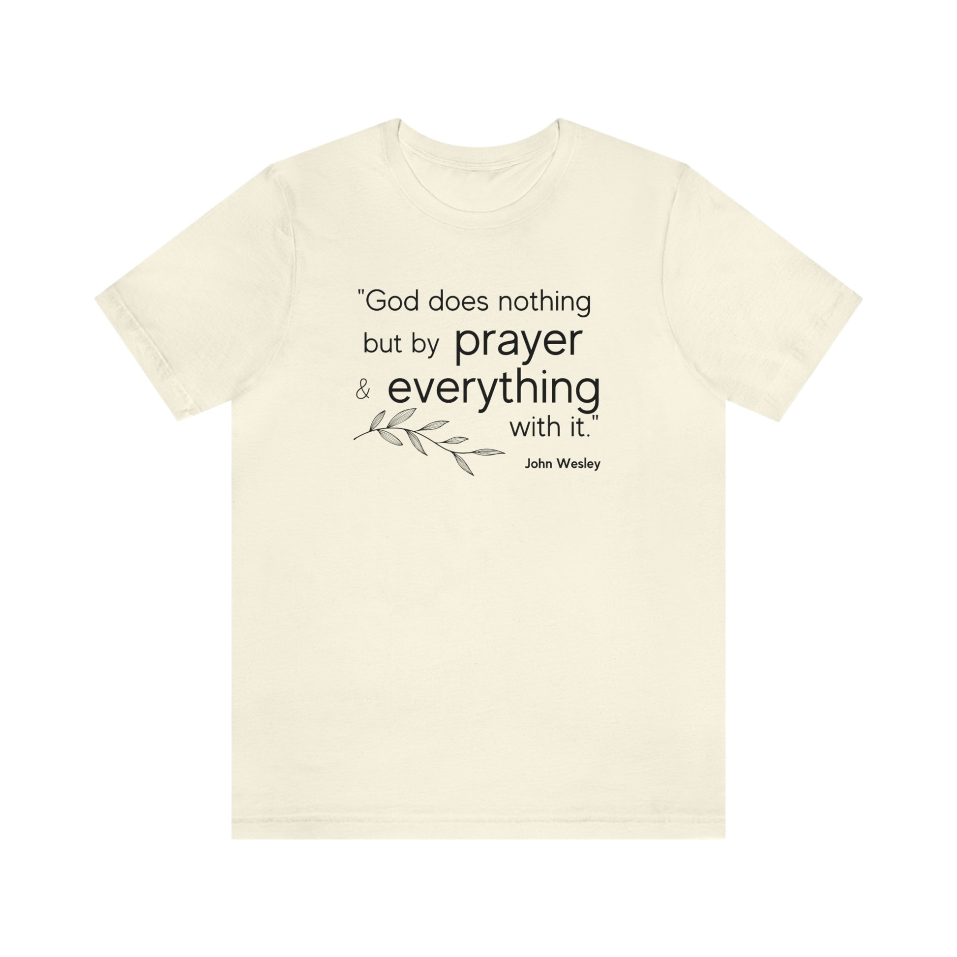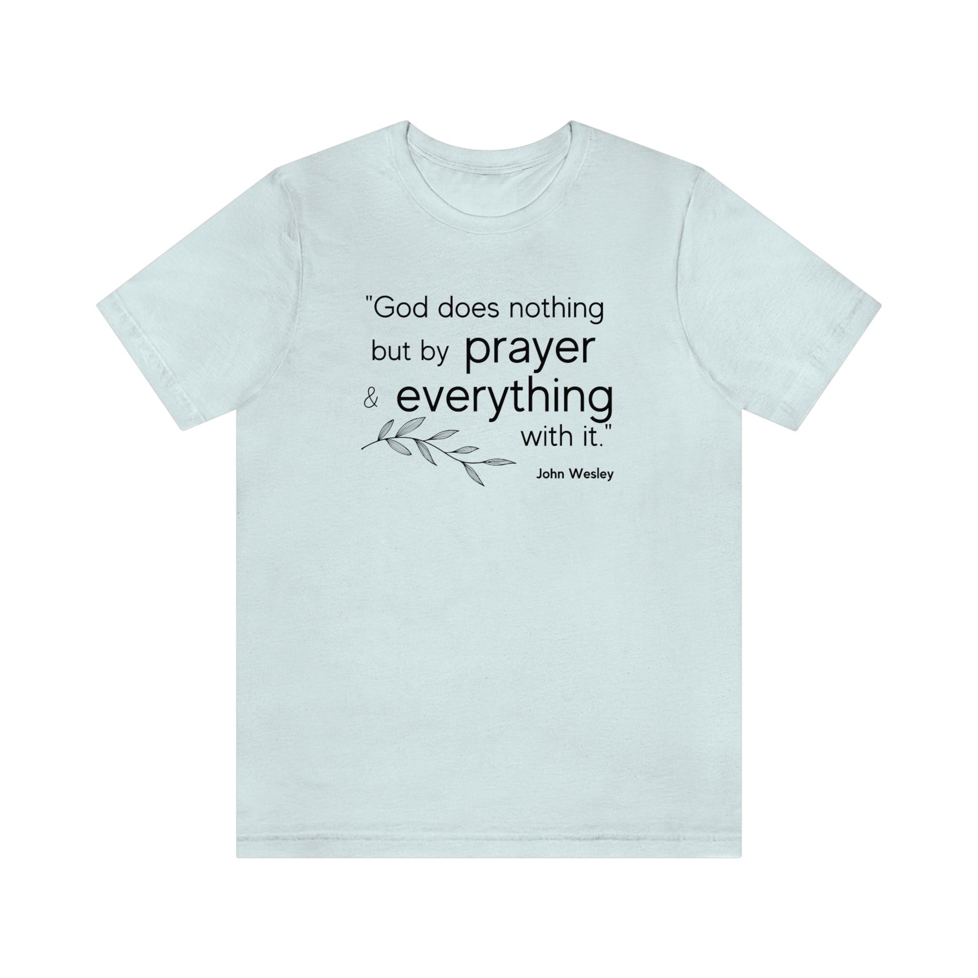 This classic jersey short sleeve tee fits like a well-loved favorite. It features John Wesley's quote "God does nothing but by prayer, and everything with it". Soft cotton and quality print make users fall in love with it over and over again. These t-shirts have-ribbed knit collars to bolster shaping. The shoulders have taping for better fit over time. Dual side seams hold the garment's shape for longer.