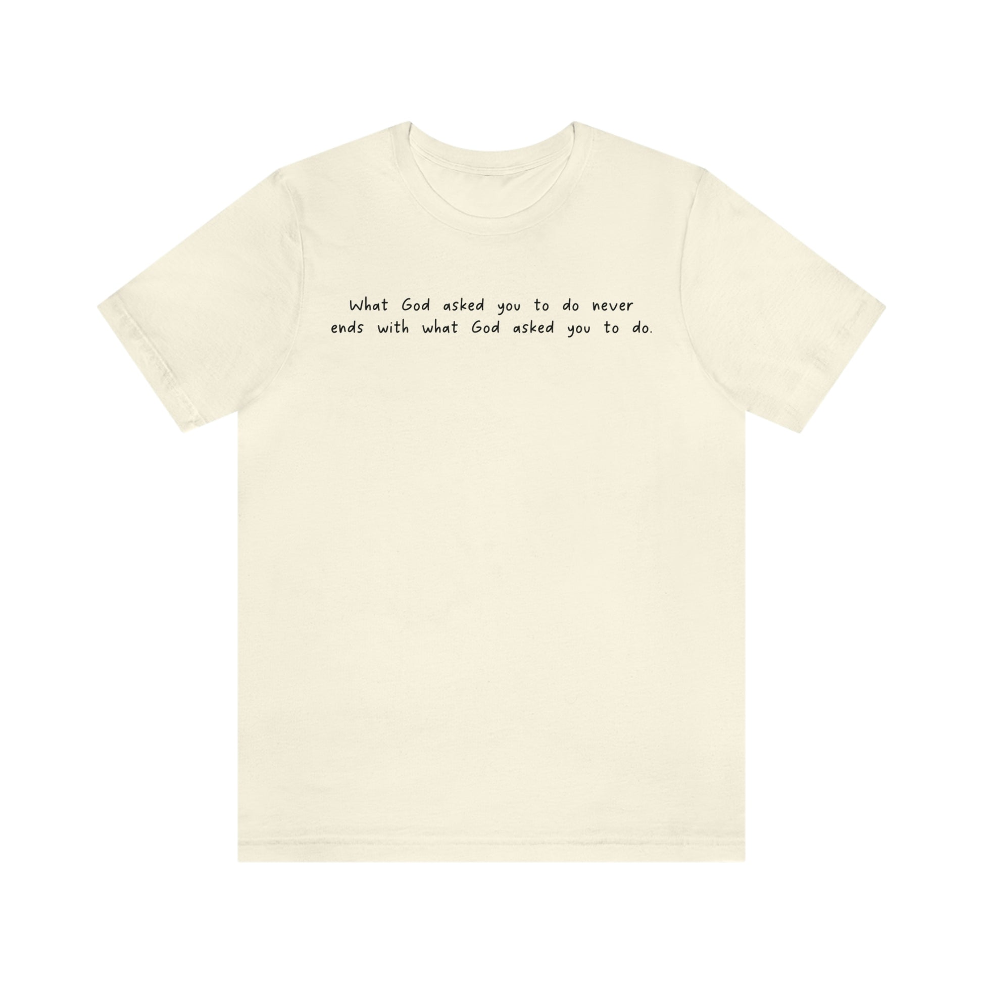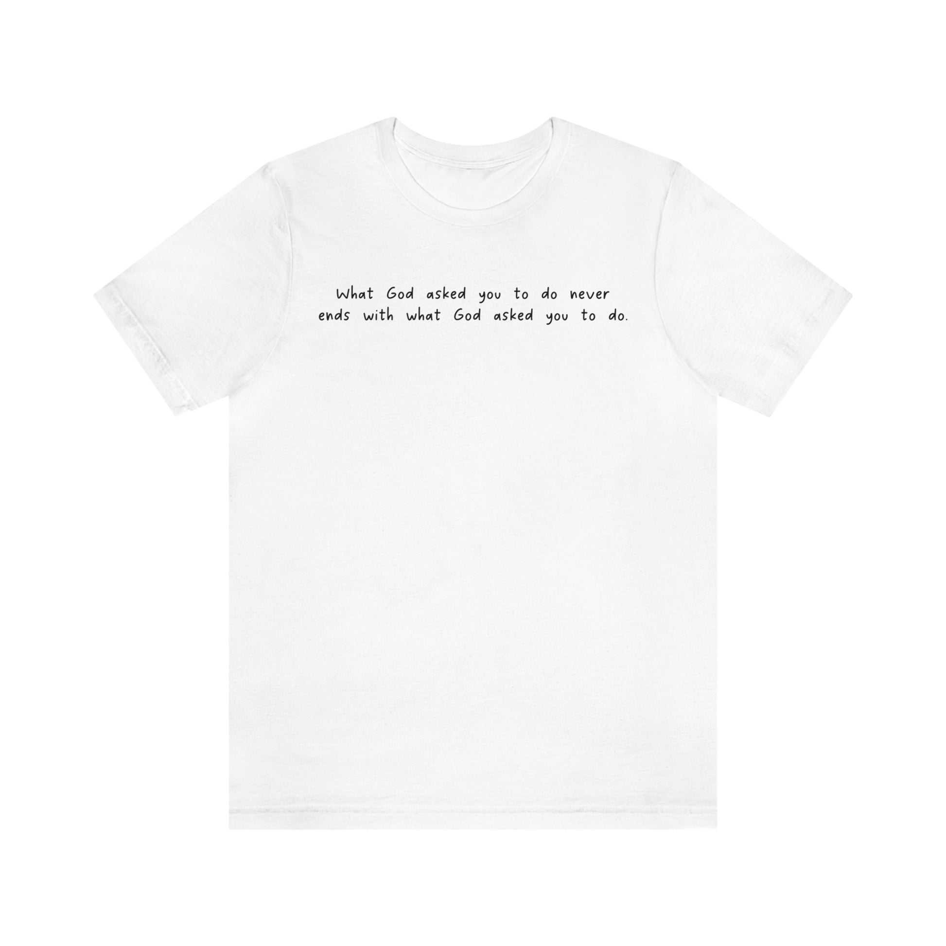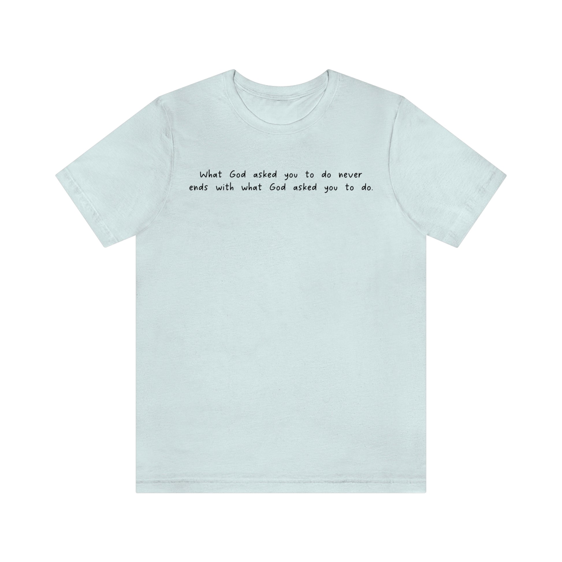 This classic jersey short sleeve tee features Cleddie Keith's famous saying "What God asked you to do never ends with what God asked you to do", and it fits like a well-loved favorite. Soft cotton and quality print make users fall in love with it over and over again. These t-shirts have-ribbed knit collars to bolster shaping. The shoulders have taping for better fit over time. Dual side seams hold the garment's shape for longer.